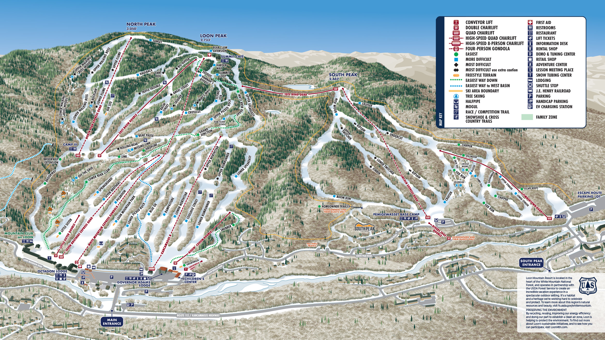 Loon Mountain offers 403 acres of skiable terrain across 3 peaks, with 73 trails suitable for all ability levels. Beginners benefit from wide, gentle slopes and expert instruction, while intermediate and advanced skiers enjoy long runs and challenging terrain. The resort features 13 lifts, including high-speed gondolas and chairlifts, ensuring quick access to the slopes. Inspireski provides tailored ski lessons focused on safety, progression, and fun.